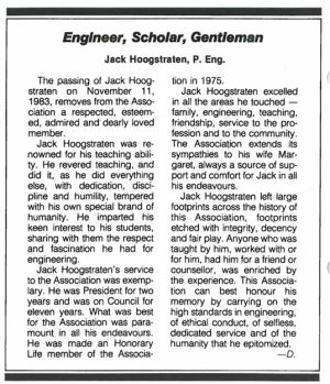 Jack Hoogstraten was married to Kathleen Margaret and had a son and a daughter. He excelled in all the areas he touched – family, teaching, Engineering, friendship and service to the profession and to the community. | Jack Hoogstraten was married to Kathleen Margaret and had a son and a daughter. He excelled in all the areas he touched – family, teaching, Engineering, friendship and service to the profession and to the community. | ||