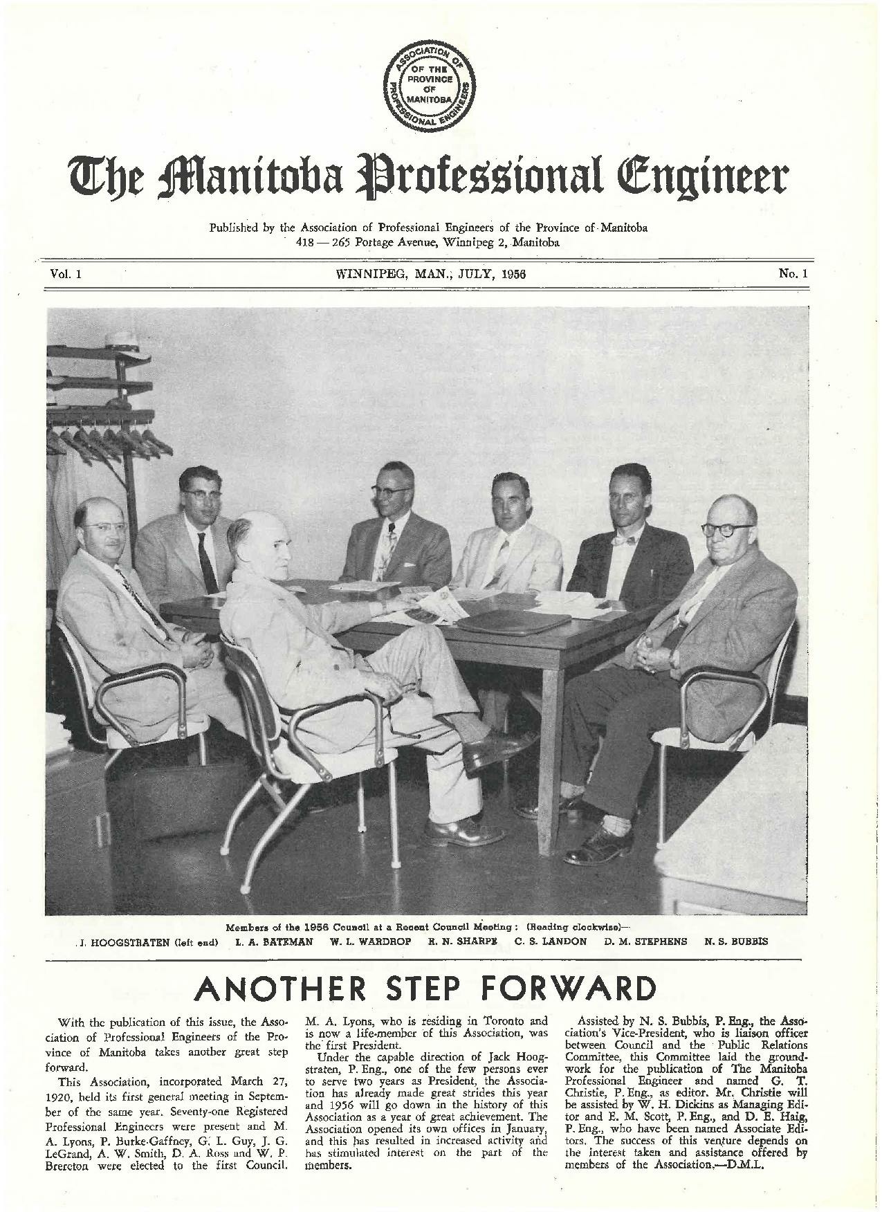 [[File:1956-07 Manitoba Professional Engineer.pdf|frame|center|1956 - First Edition of the Manitoba Professional Engineer]] | [[File:1956-07 Manitoba Professional Engineer.pdf|frame|center|1956 - First Edition of the Manitoba Professional Engineer]] | ||