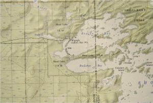 "Shoal Lake is connected to Lake of the Woods at a location known as Ash Rapids. Construction of a control dam at the outlet of Lake of the Woods in the 1880s raised the level of the lake by about a metre above its natural condition. In turn, this brought water levels in Shoal Lake into approximate balance with levels in the much larger Lake of the Woods, at least over an extended portion of the year. The channel at Ash Rapids was deepened and widened from its natural state, through blasting, around the turn of the century [1900]. This was reportedly done to provide a water based transportation route to serve both timber and mining operations in the Shoal Lake area." | ''"Shoal Lake is connected to Lake of the Woods at a location known as Ash Rapids. Construction of a control dam at the outlet of Lake of the Woods in the 1880s raised the level of the lake by about a metre above its natural condition. In turn, this brought water levels in Shoal Lake into approximate balance with levels in the much larger Lake of the Woods, at least over an extended portion of the year. The channel at Ash Rapids was deepened and widened from its natural state, through blasting, around the turn of the century [1900]. This was reportedly done to provide a water based transportation route to serve both timber and mining operations in the Shoal Lake area."'' | ||