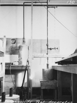 The compression testing program, with specimens 8" (20cm) in diameter and 16" (40cm) long, seems to have followed standard procedures. However, the permeability test, if not unique, was at a minimum innovative. The concrete specimens were 13" (33 cm) in diameter and 14.5" (37cm) long and cast with a small internal chamber connected to a metal injection pipe with an external water-stop. The test apparatus forced water into the chamber at a constant pressure with a gauge to measure the water entering the specimen with a means of measuring the amounts passing through the concrete, and a separate measure of any leakage from around the pipe used for the injection. A photo of the apparatus used in the test is shown in Figure 2.