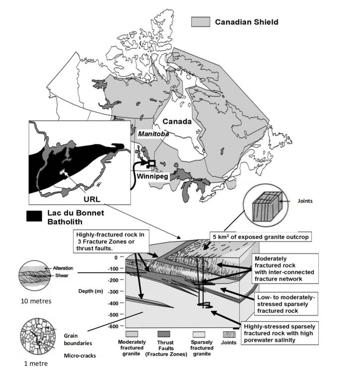 The Underground Research Laboratory (URL) was constructed in the Canadian Shield 18 km east of Lac du Bonnet, Manitoba (Figures 1 and 3). Its purpose was to study the safety and feasibility of long-term containment and isolation of Canada’s used nuclear fuel in a deep geologic repository. The laboratory timeline began with siting investigations in 1978 and ended with shaft closure in 2010. The URL was unique in Canada and was only one of a few facilities of its kind in the world. The quality of the research program and a unique variety of crystalline rock environments attracted international attention. International research participants at the URL included the USA, Japan, France, Korea, Sweden, and Finland. Engineers Geoscientists Manitoba awarded the 1990 Team Achievement Award to the URL project for contributions to geoscience and engineering. In the early 2000’s, the URL was designated as one of the International Atomic Energy Association’s (IAEA) centres of excellence for training in and demonstration of, technologies for radioactive waste disposal.