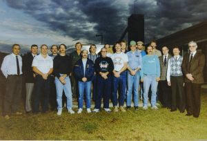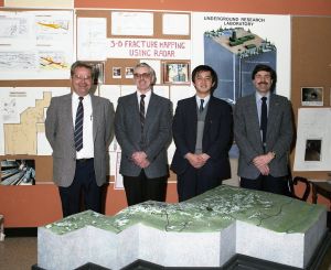 • 3-D fracture mapping at URL Radar Survey. Left to right: Art Hollaway, Gary Simmons, Japanese visitor and Cliff Davison, Photo courtesy of Ganpat Lodha.