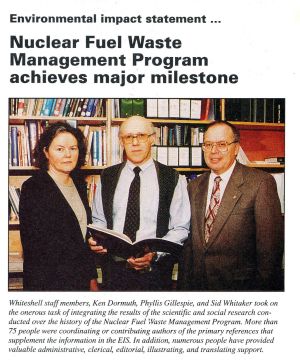• Whiteshell Community Reporter Dec 1994 Vol 2 no 2 - Sid Whitaker, Ken Dormuth & Phyllis Gillespie with EIS submission. Photo courtesy of Ganpat Lodha.