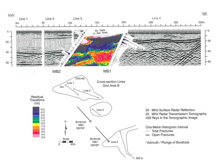Figure 6: Integrated cross-hole and surface radar surveys at Grid Area ‘B’. Figure courtesy of John Hayles.