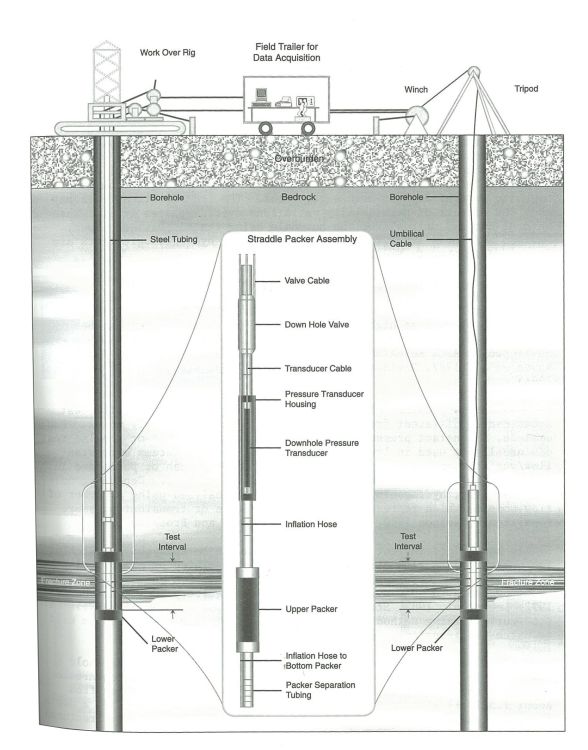 Single-hole hydraulic tests using straddle packer testing in multiple-interval casing systems and large-scale crosshole pumping tests provided estimates of the in-situ permeability (Figure. 8). Crosshole tracer tests were performed in several of the major fracture zones to estimate the solute transport properties and to provide information to scale up the properties to the regional modeling scales. Geochemical and hydrogeochemical characterization of host rock fracture-infilling minerals, groundwaters and porewaters provided data for flow modelling as well as obtaining information on groundwater ages, sources of salinity and rock-water interactions.