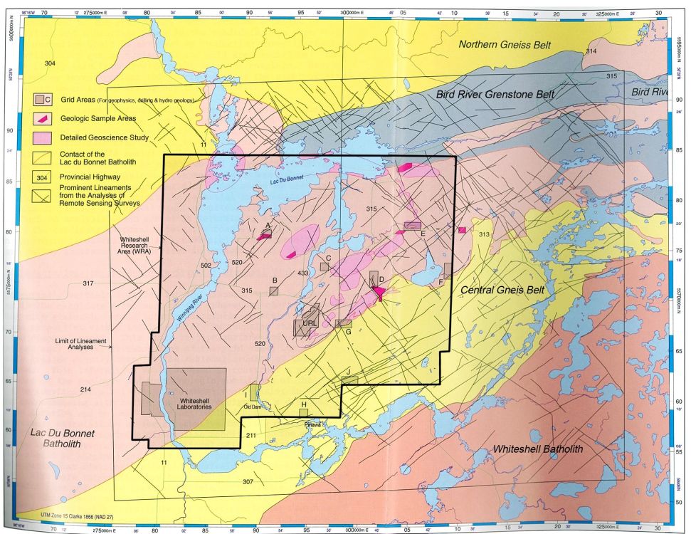 The Lac du Bonnet Batholith lies in the southern part of the English River Subprovince of the Winnipeg River batholith zone. The batholith is in sharp contact with the Bird River Greenstone Belt to the north and in gradational contact with foliated tonalite-granodiorite gneisses and migmatite. The batholith trends east-northeast, with about 1500 km2 of exposed rocks east of the Paleozoic rock cover. The initial fault/fracture identification shown in Figure 2 is partly based on several types of satellite data, airborne geophysical data, airphoto data and available bedrock geology maps. This is followed by detailed surface geological mapping, ground geophysics, surface hydrological and associated studies. The geology of the Underground Research Laboratory (URL) site is representative of the batholith. The gross structure, the variations in its large­-scale litho-structural components, and the orientation of smaller scale fabric elements affect the distribution of some of the fractures and low-dipping fault zones. AECL mapped the batholith for type, lithology, and fracture frequency at a scale of 1:50,000 and the URL site for lithology and fracture characteristics and distribution at a scale of 1:1000. Detailed geoscience studies at the URL site and five other smaller grid areas 'A', 'B', 'D', 'G’ and 'J' shown in Figure 2 were continued, until the completion of the environmental review process in 1998 and the transfer of the program to the Nuclear Fuel Waste Management Organization (NWMO) in 2002.