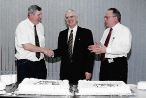 • Left to right: Gary Simmons with Colin Allen and Ken Dormuth on completing 30 years of service at URL. Photo courtesy of Ganpat Lodha.