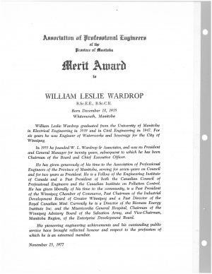 - Citation delivered by Dr. Doug Ruth, Dean, Faculty of Engineering - W. L. Les Wardrop, D. Sc., May 2006. (presentation of his doctorate by the University of Manitoba.)