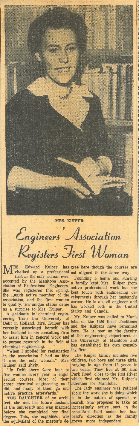 A few months following Judith Weiszmann’s initial application, a second woman applied to the Association for registration. This time the application was accepted and on April 20th, 1959, Minke Kuiper became the first woman registered in the Association’s history of professional self-regulation dating back to 1920. She was a graduate from the Technical University of Delft in Holland and immigrated to Canada in 1950 with her husband, and fellow engineer, Edward Kuiper. She had a degree in chemical engineering and worked part time with her husband. Edward Kuiper was a well-known and respected engineer as he worked on the hydraulic design of the Red River Floodway, then went on to have a long teaching career at the University of Manitoba.